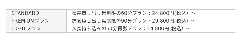 - 衣装・小物・背景紙の貸出が無制限で、撮影データも当日中に全データ納品(色味補正済み)