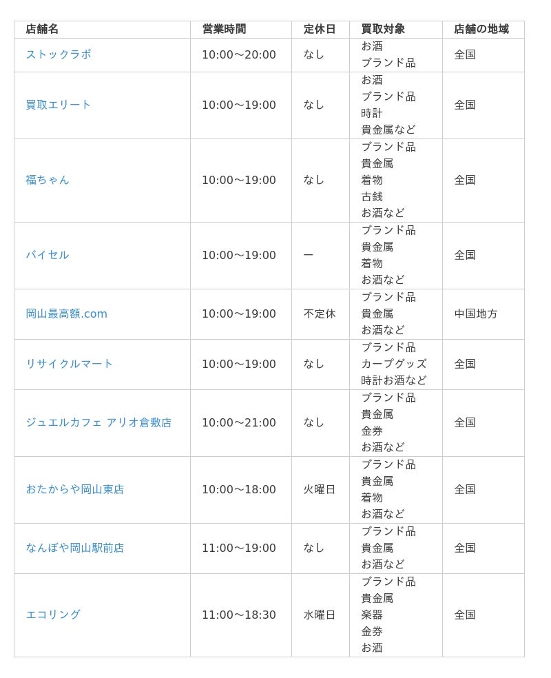 このような障壁を取り除くため、今回は買取地域の広さに特に着目しました。岡山県はもちろん、全国どこでも対応できる買取業者であれば、利便性が高いだけでなく、より多くの方々が安心して利用できると考えたからです。