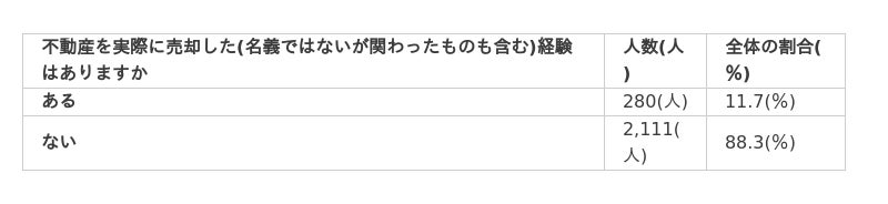 不動産を実際に売却した(名義ではないが関わったものも含む)経験がある方は全体の11.7%でした。