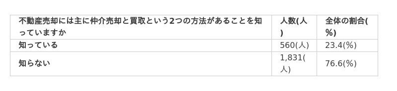 不動産売却には主に仲介売却と買取という2つの方法があることを知っている方は、全体の23.4%と多い割合ではありません。