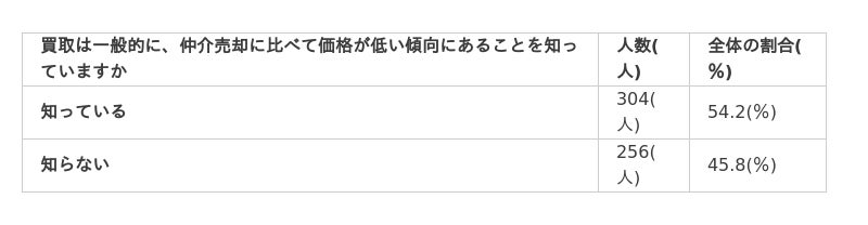 買取は一般的に、仲介売却に比べて価格が低い傾向にあることを知っている方は54.2%です。