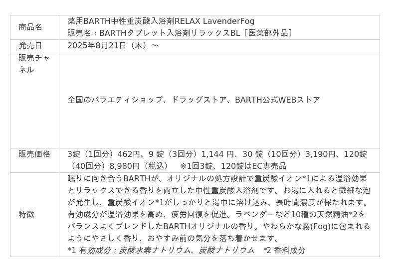 バスタイムからスリープタイムまでワンランク上のナイトルーティンを提案するナイトウェルネスブランド「BARTH(バース)」の中性重炭酸入浴剤は、「重炭酸イオン*1」を含むお湯が温浴効果により血行を促進、疲労回復などへの効果が期待できるアイテムです。この特長を活かしながら、新たにリラックスできる「香り」を加えた『薬用BARTH中性重炭酸入浴剤RELAX LavenderFog』を2025年8月21日(木)に発売します。