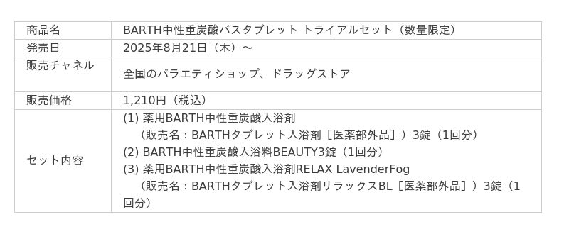 3種類をお試しいただける『BARTH中性重炭酸バスタブレット トライアルセット』も2025年8月21日(木)より発売します。
