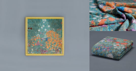 五彩織りとは、独自の技術で特許を取得し、先染めの糸で、カラフルな写真や絵画を再現し織り上げる技法。色鮮やかな花々が描かれた、繊細で美しい作品をパイルで描かれている。期間中、今治タオル南青山店で展示および販売。今治タオルデジタルアートギャラリーではデジタル展示中。
