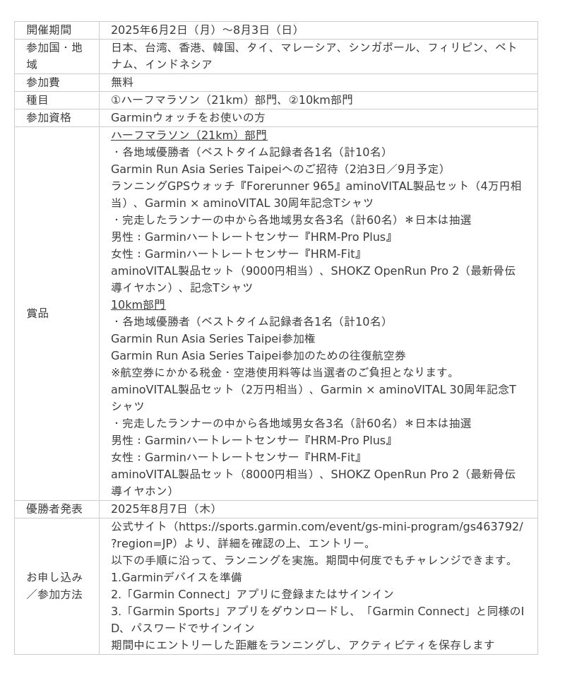 今年は、ハーフマラソン部門で各地域のベストタイムを記録した優勝者には、9月に台湾で開催されるGarmin Run Asia Series Taipeiへの招待旅行、GarminのランニングGPSウォッチ『Forerunner 965』などが贈られます。10km部門の優勝者にもGarmin Run Asia Series Taipeiの参加権と往復航空券をプレゼントします。
