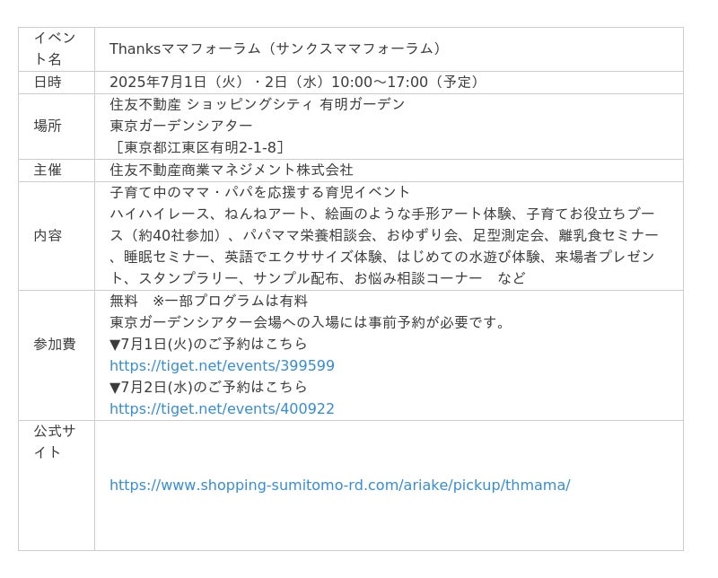 住友不動産商業マネジメント株式会社(本社:東京都新宿区、代表取締役社長:山本 直人)は、子育て中のママ・パパを応援するイベント「Thanksママフォーラム」を、2025年7月1日(火)・2日(水)の2日間、有明ガーデン(所在地:東京都江東区)にて開催いたします。