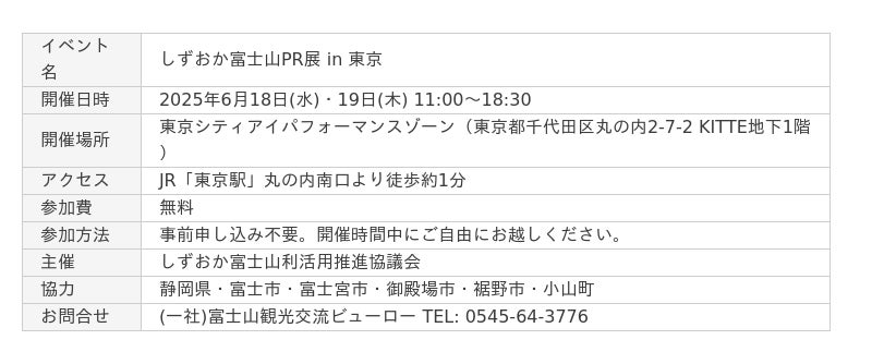 このイベントでは、富士山の山開きを前に、富士山登山にむけた最新情報の発信や富士山を写真と動画で紹介、地元市町村の観光案内・特産品の展示即売会を実施します。