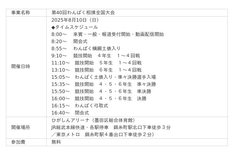 「第40回わんぱく相撲全国大会『夢をこの手に、わんぱくピース!』」2025年8月10日(日)@ひがしんアリーナにて現地開催、YouTubeでライブ配信