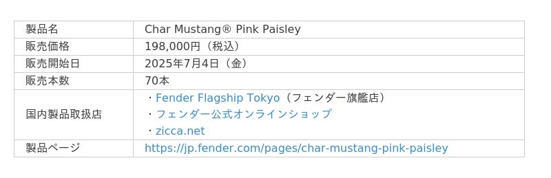 フェンダーミュージック株式会社(所在地:東京都渋谷区、代表取締役社長アジアパシフィック統括 エドワード・コール)は、日本のロック史に多大な影響を与え続けるギタリスト、Charの新シグネイチャーモデル『Char Mustang(R) Pink Paisley』を発表しました。本モデルは、Charの70歳という節目の年にちなんで70本限定で生産され、東京・日本武道館で開催される古希をお祝いするバースデーライヴ<Char Nippon Budokan Live 2025 - Purple Phase Jam>の開催日である7月4日(金)に発売されます。Fender Flagship Tokyo(東京・原宿)、フェンダー公式オンラインショップおよびChar公式サイトzicca.netにてお買い求めいただけます。(※フェンダー公式オンラインショップおよびFender Flagship Tokyoでは、7/4(金)午前11時より販売を開始します。)