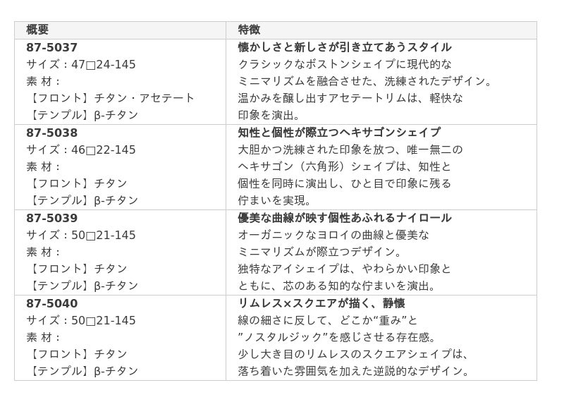 シルエットは、どこか懐かしさを感じさせる王道のアイシェイプ。普遍的な美しさを備えたタイムレスなフォルムは、クラシカルなムードと現代の洗練を両立。ノスタルジックな空気をまといながらも、日常に自然と溶け込むデザインに仕上がっています。