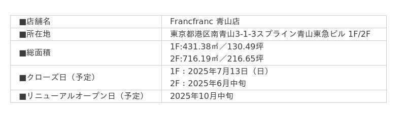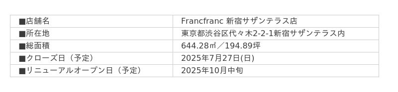 Francfrancは、デザイン性のある家具やインテリア雑貨と、そのコーディネートにより、お客様に心高鳴るライフスタイルを提案するブランドです。今回のリニューアルは、改めてその原点に立ち返り、Francfrancらしいライフスタイル提案を通じ、より一層お客様に“心の高鳴り”を感じていただける空間を目指すものです。今後、リニューアルオープンに向け、ブランドの想いやリニューアルに関する情報を順次発信してまいりますので、ぜひご期待ください。