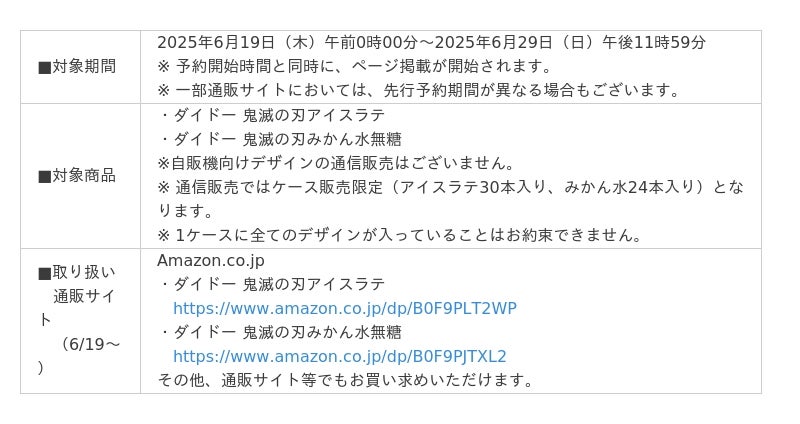 アニメ「鬼滅の刃」とコラボした「ダイドー 鬼滅の刃アイスラテ」「ダイドー 鬼滅の刃みかん水無糖」について、6月30日(月)の自動販売機、量販店等での発売に先駆けて、6月19日(木)より通信販売にて先行予約をスタートいたします。(※自販機向けデザインの通信販売はございません。)