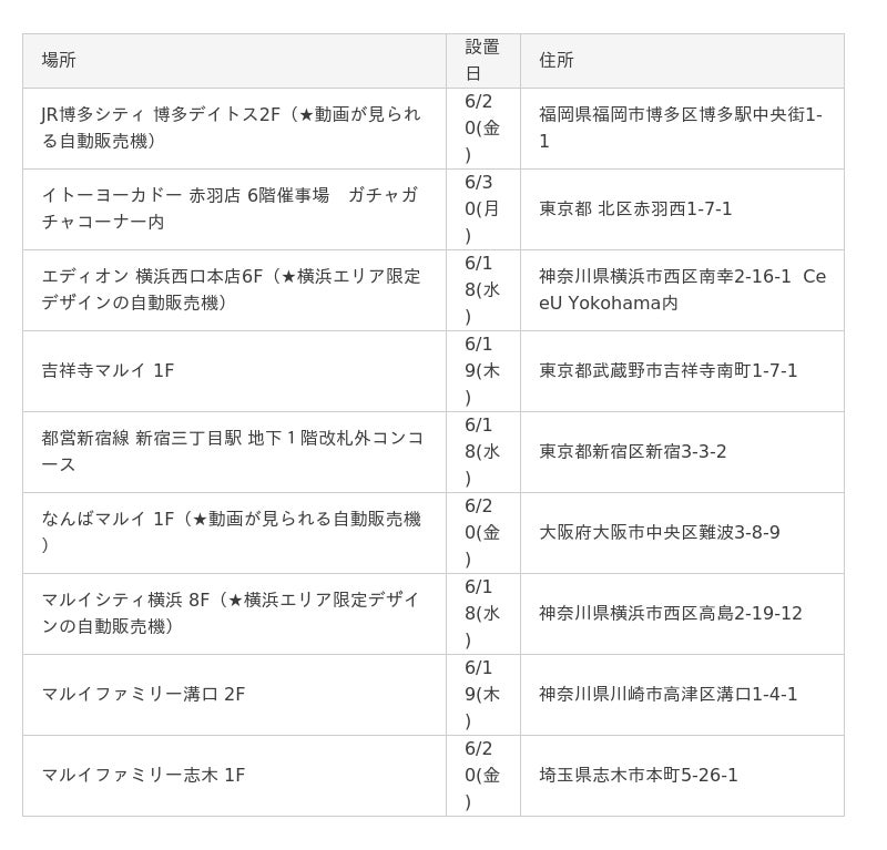 自動販売機は、6月18日(水)より都営新宿線新宿三丁目駅、マルイ各店やJR博多駅などで順次展開致します。自動販売機の設置場所が新たに増える際は、自動販売機設置場所一覧や公式SNSにてお知らせします。お近くにお越しの際はぜひお立ち寄りください。