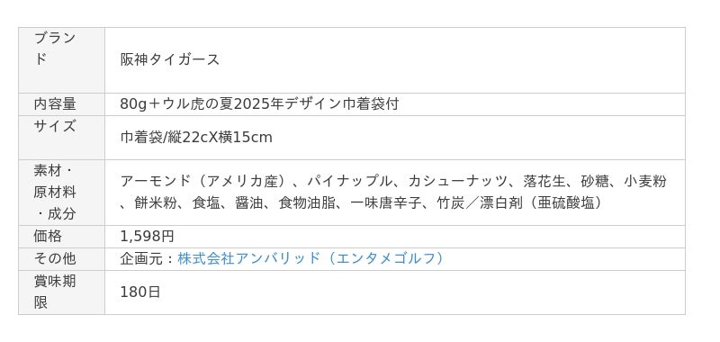 ユニークなゴルフコンペ景品や記念品の製造販売を手掛ける株式会社アンバリッド(本社:大阪市 代表取締役:古谷理朗)は、2025年、球団創設90周年を迎える阪神タイガース恒例の夏イベント「ウル虎の夏2025」の協賛スポンサーを務めている縁で、ウル虎の夏2025デザインの巾着袋入り【ウル虎のナッツ】内容量:80g 価格:1,598円(税込)を新発売、2025年6月16日から本格販売することとなりました。