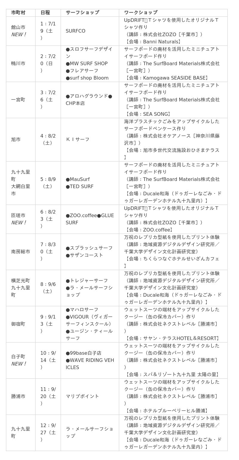 旭市、匝瑳市、横芝光町、九十九里町、大網白里市、白子町、一宮町、御宿町、勝浦市、鴨川市、南房総市、館山市にて、サーフィン体験とともに、サーフィンを中心としたライフスタイルや、千葉の海や地域の魅力を体感できるイベントを開催するものです。(合計12回、総計240名)