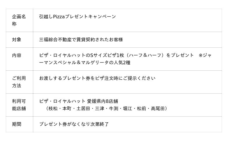 愛媛県松山市を中心にアパマンショップ加盟店を運営する株式会社三福綜合不動産(代表取締役社長:中矢孝則)は、賃貸物件をご契約いただいたお客様へ、地元人気ピザチェーン「ピザ・ロイヤルハット」Sサイズピザ1枚をプレゼントする「引越しPizzaキャンペーン」を開始いたしました。