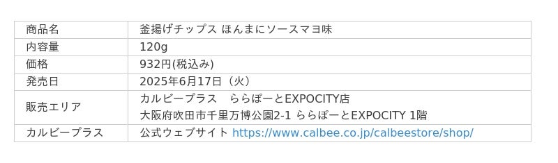 カルビー株式会社(本社:東京都千代田区、代表取締役社長兼CEO:江原 信)は、「カルビープラス ららぽーとEXPOCITY店」にて『釜揚げチップス ほんまにソースマヨ味』を2025年6月17日(火)より新発売します。