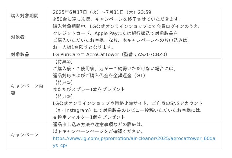 6月9日(月)よりLG公式オンラインショップにて一般発売を開始いたしましたが、この度、お客様がより安心して「LG PuriCare(TM) AeroCatTower」をお求めいただき、愛猫とともにじっくりと製品をご体験いただけるよう、先着50台限定で60日間返品保証キャンペーンを実施することといたしました。