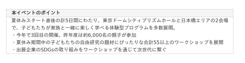 昨年度約4,000名を動員した東京ドームシティプリズムホール会場ですが、今年は7月19日(土)、20日(日)の2日間にわたり開催します。3回目となる今回は20社以上ブースを出展し、ワークショップ形式で子どもたちの学びの機会を提供します。
