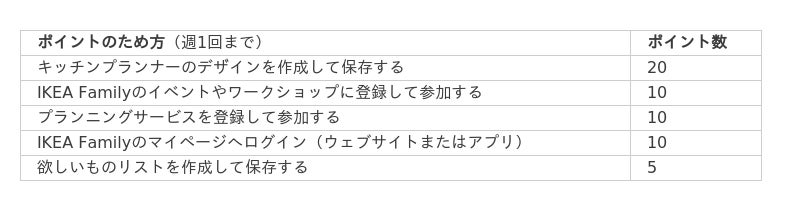 お買い物だけでなくイケアのウェブサイトやIKEAアプリでのIKEA Familyアカウントへのログインで毎週ポイントがたまります。さらにキッチンプランナーのデザインを作成して保存したり、 IKEA Family対象のイベントやワークショップに登録して参加するなど、イケアとのさまざまなインタラクション(交流)を通じてポイントを獲得できます。