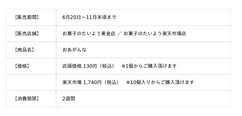 株式会社太陽社(所在地:千葉県匝瑳市飯倉293、代表取締役:片岡正裕)が展開する千葉県で長年愛される菓子店「お菓子のたいよう」は、東金店限定・洋風もっちりチーズケーキまんじゅう『おあがんな』を、今年も6月20日より販売いたします。
