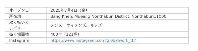 株式会社アダストリア(本部:東京都渋谷区渋谷2-21-1、代表取締役社長:木村 治)が展開するカジュアルブランド「GLOBAL WORK(グローバルワーク)」は、東南アジア初出店となる「GLOBAL WORK ザ・モール・ライフストア・ガムウォンワン」をタイ・バンコクの北の玄関口になるエリアであるノンタブリー市に2025年7月4日(金)オープンいたします。