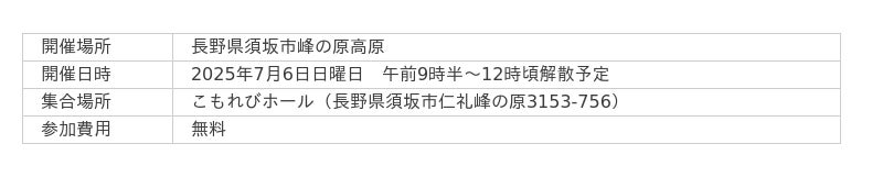 「2025 峰の原の草原を作ろう!」主催:峰の原高原観光協会。今年から、NPO法人信州草原再生が共催として参加、7月6日(日)学術的にも注目される長野県峰の原高原で開催。参加者募集中。