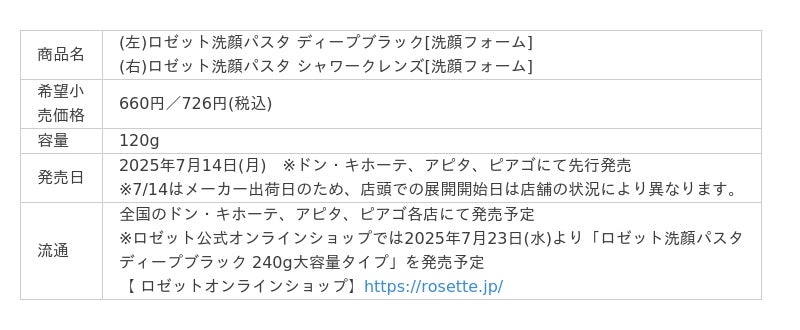 ロゼット株式会社(本社:東京都品川区、代表取締役社長:藤井 敬二)は、95年以上続くロングセラー洗顔ブランド『ロゼット洗顔パスタ』から、2つの新商品「ロゼット洗顔パスタ ディープブラック」「ロゼット洗顔パスタ シャワークレンズ」を、ドン・キホーテ、アピタ、ピアゴにて2025年7月14日(月)より先行発売いたします。