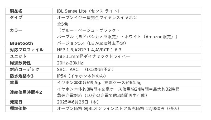 ハーマンインターナショナル株式会社(本社:東京都千代田区、代表取締役:桑原拓磨)は、アメリカ カリフォルニア発祥の世界最大級のオーディオブランドであり、日本においてワイヤレススピーカー7年連続販売台数No.1※1に輝く「JBL」より、オープンイヤー型完全ワイヤレスイヤホン「JBL Sense Lite(センス ライト)」を2025年6月26日(木)より発売いたします。