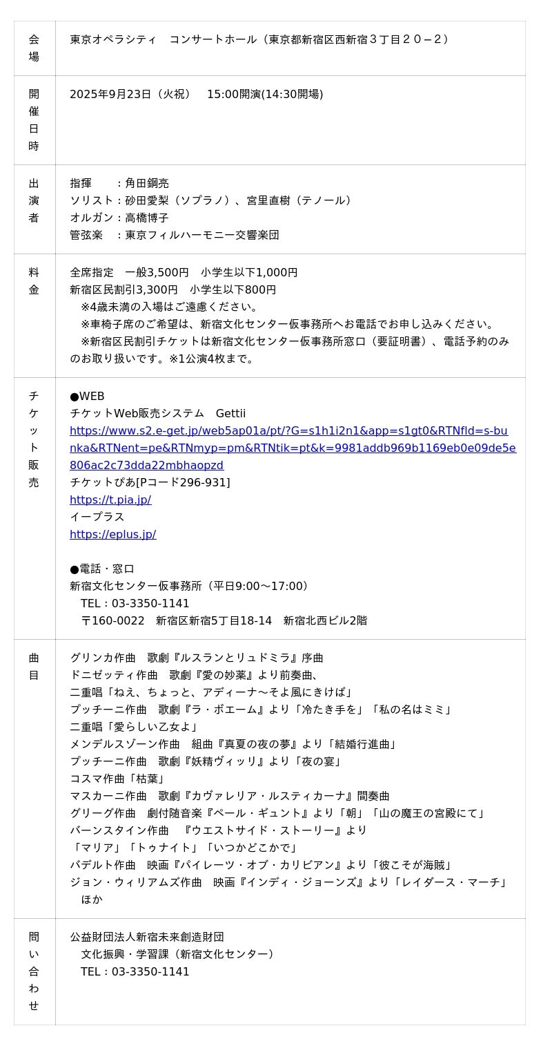公益財団法人新宿未来創造財団・公益財団法人東京都歴史文化財団 東京文化会館主催、東京オーケストラ事業協同組合企画協力の『フレッシュ名曲コンサート~ライトクラシック・コンサート~』を、2025年9月23日(火祝)に東京オペラシティ コンサートホール(東京都新宿区西新宿3丁目20−2)にて開催します。