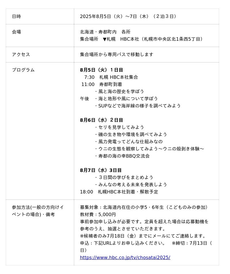 「寿都湾・海と風の調査隊2025」への参加申し込み締め切りは、7月13日(日)まで。HBCホームページの申し込みフォーム(https://www.hbc.co.jp/tv/chosatai2025/)よりご応募ください。