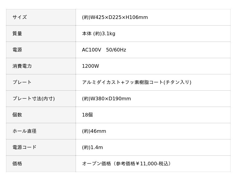 直径約46mmのたこ焼きが一度に18個焼けます。一般的な家庭用たこ焼き器(当社調べ:平均約38mm)より大きい、 街の人気店と同じ本格サイズです。一口食べた瞬間の「これぞ本物」という満足感、熱々トロトロのたこ焼きをご家庭で楽しめます。