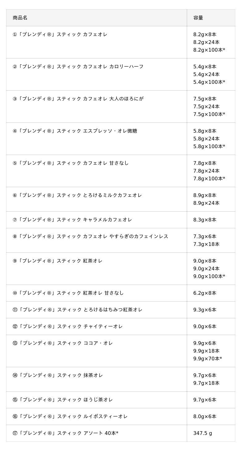 17.《「ブレンディ(R)」スティック アソート 40本》は、気分や好みに合わせて、好きな甘さのカフェオレやフレーバーを楽しめる「ブレンディ(R)」スティックのアソートタイプです。