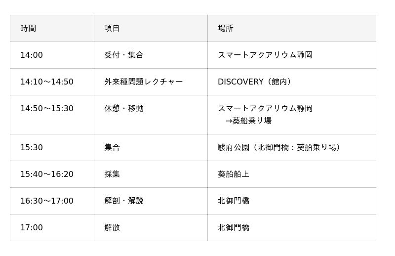 本イベントでは、外来種問題への理解を深めることを目的として、葵船からブルーギルを釣ってその現状を調査します。また、事前に水族館で外来種問題に関するレクチャーを実施して知識を深め、釣り調査の後は解剖を実施してブルーギルが実際に何を食べているかも調査します。釣り上げた個体は駆除した後、駿府城公園の肥料として再活用します。