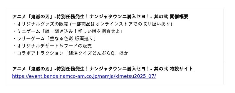 株式会社バンダイナムコエクスペリエンスが企画・プロデュースする屋内型テーマパーク「NAMJATOWN(ナンジャタウン)」(東京・池袋)は、アニメ「鬼滅の刃」との6回目のコラボレーションイベント『アニメ「鬼滅の刃」-特別任務発生!ナンジャタウンニ潜入セヨ!- 其の弐』を、2025年7月11日(金)から9月21日(日)まで開催します。