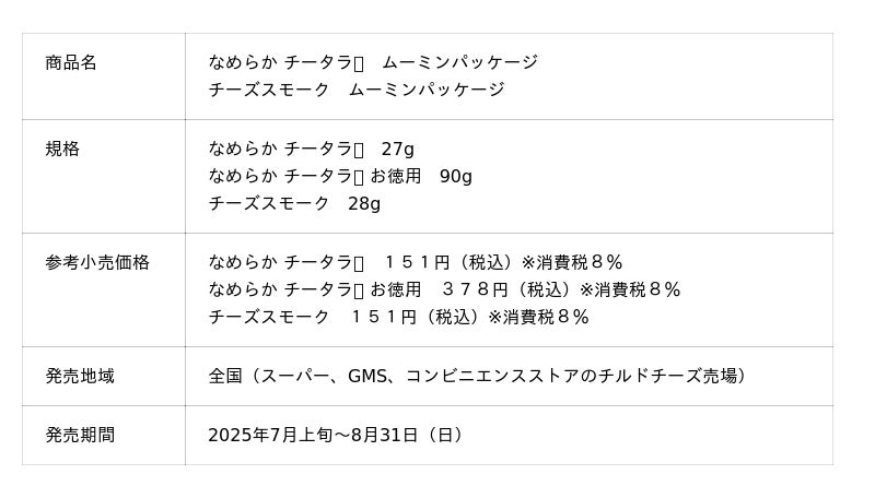 株式会社なとり(本社:東京都北区 会長兼社長:名取三郎)は、「なめらか チータラ(R)」シリーズ6品と「チーズスモーク」の全7品【要冷蔵】の「ムーミン」パッケージを期間限定で2025年7月上旬より順次発売します。