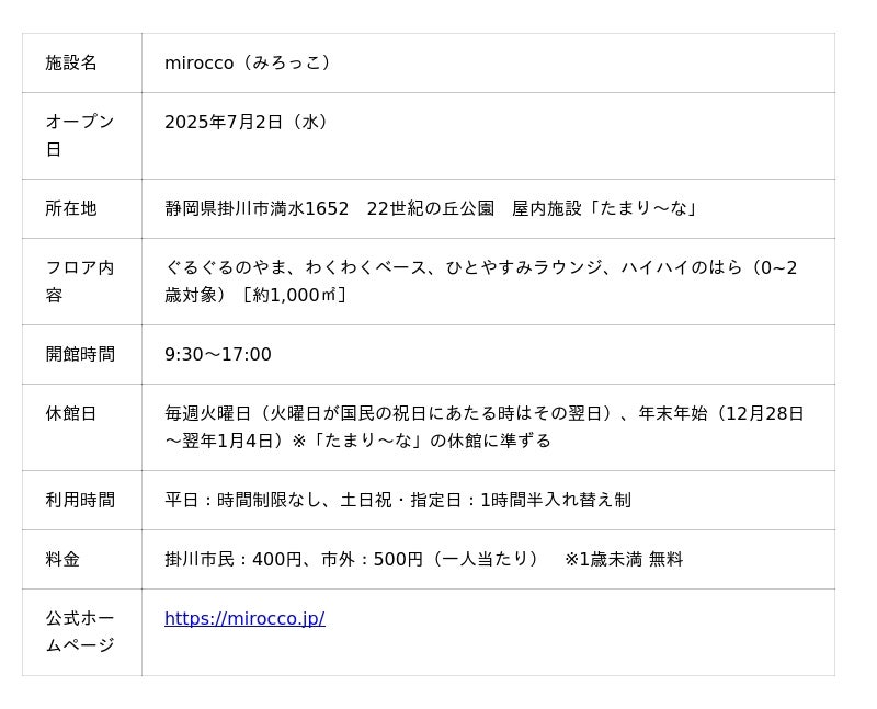 2025年7月2日(水)、静岡県掛川市に新たな屋内遊び場「mirocco(みろっこ)」がオープンします。子どもたちが思いきり遊びを楽しむだけでなく、家族や地域の人々も一緒に楽しめる場所を目指しています。本施設は掛川市満水の22世紀の丘公園にある屋内施設「たまりーな」にあったプール・温浴施設を改修し、全天候型の遊び場に再整備を進めてきました。