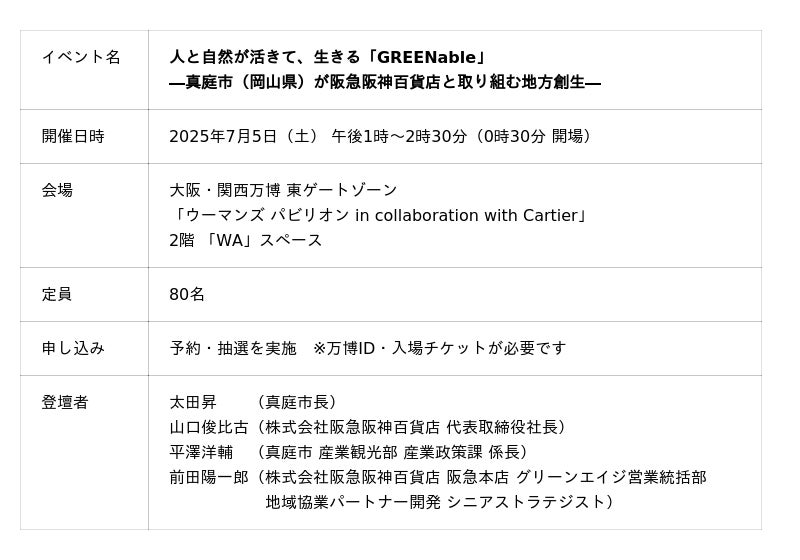 2025年7月5日、株式会社阪急阪神百貨店(本社:大阪市北区、代表取締役社長:山口俊比古)は、「SDGs未来都市」の岡山県真庭市(市長:太田昇)と、大阪・関西万博の「ウーマンズ パビリオン in collaboration with Cartier」でトークセッションを開催します。演題は、「人と自然が活きて、生きる『GREENable(グリーナブル)』―真庭市(岡山県)が阪急阪神百貨店と取り組む地方創生―」です。