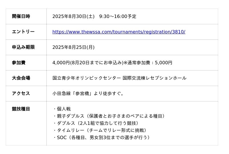 この度、子どもたちの健やかな成長を願い都内50か所の保育園・幼稚園での運動あそびを展開する、有限会社さわだスポーツクラブ(本社:東京都練馬、取締役社長:澤田 康徳、以下さわだSC)は、WSSA-JAPANが主催する「2025年スポーツスタッキング ジャパンカップ11th」にさわだSC所属選手が出場致しました。