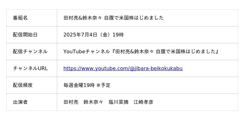 近年、YouTubeなどで「米国株投資」を扱う番組が増えてきました。しかし、この番組は一味違います。投資初心者である田村亮と鈴木奈々がそれぞれ100~200万円を自腹で用意。口座の開設から米国株の購入、その後の資産変化まで米国株投資のリアルをお届けしていきます。