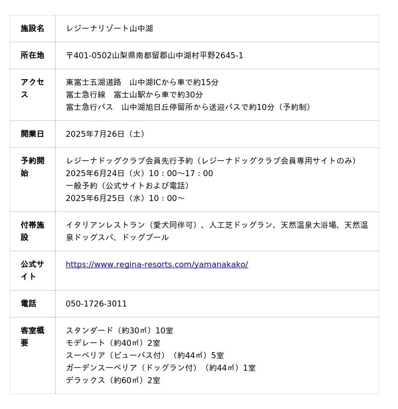 東京建物株式会社のグループ会社である東京建物リゾート株式会社は、富士山と山中湖の絶景を望む※1愛犬同伴型ラグジュアリーリゾートホテル「レジーナリゾート山中湖」を2025年7月26日(土)に開業しますので、お知らせします。また、開業に先立ち、レジーナドッグクラブ会員先行宿泊予約を6月24日(火)より、一般予約を6月25日(水)より開始します。