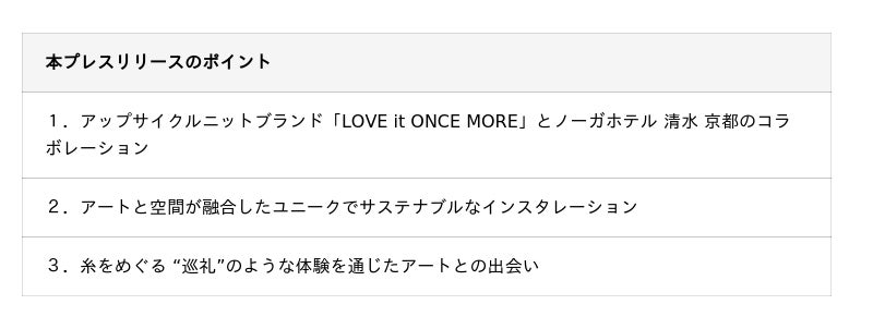 野村不動産ホテルズ株式会社(本社:東京都新宿区/代表取締役社長:石井康裕、以下「当社」)が運営する「ノーガホテル 清水 京都(以下「ノーガホテル京都」)」は、ニットデザイナーMaro Kuratani氏が主宰するアップサイクルのハンドメイドニットブランド「LOVE it ONCE MORE(以下「ラヴィットワンスモア」)」とコラボレーションし、2025年7月12日~2025年7月27日まで、『Ito Pilgrims “糸の巡礼者たち”』をテーマに、ホテルを舞台にしたインスタレーションを開催いたします。