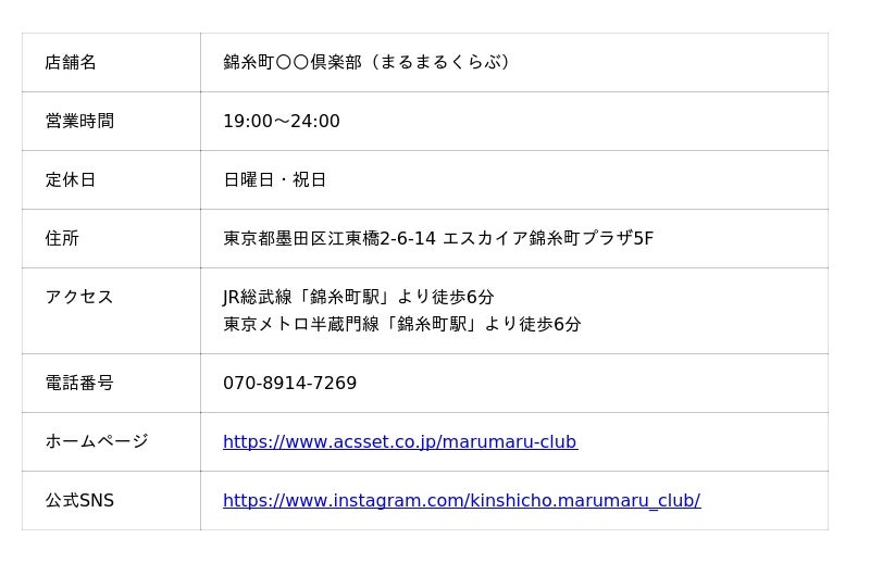 不動産業を軸に福祉・医療・飲食など多角的に事業を展開する株式会社アクセット(本社:東京都港区、代表取締役:椎名健仁)は、2025年6月29日、東京・錦糸町に新店舗となるスナック&バー「錦糸町○○倶楽部(まるまるくらぶ)」をオープンいたします。お酒を楽しむのも、雰囲気に浸るのも、おしゃべりに花を咲かせるのもすべてお客様次第。思い思いの時間を過ごせる空間を目指して営業してまいります。