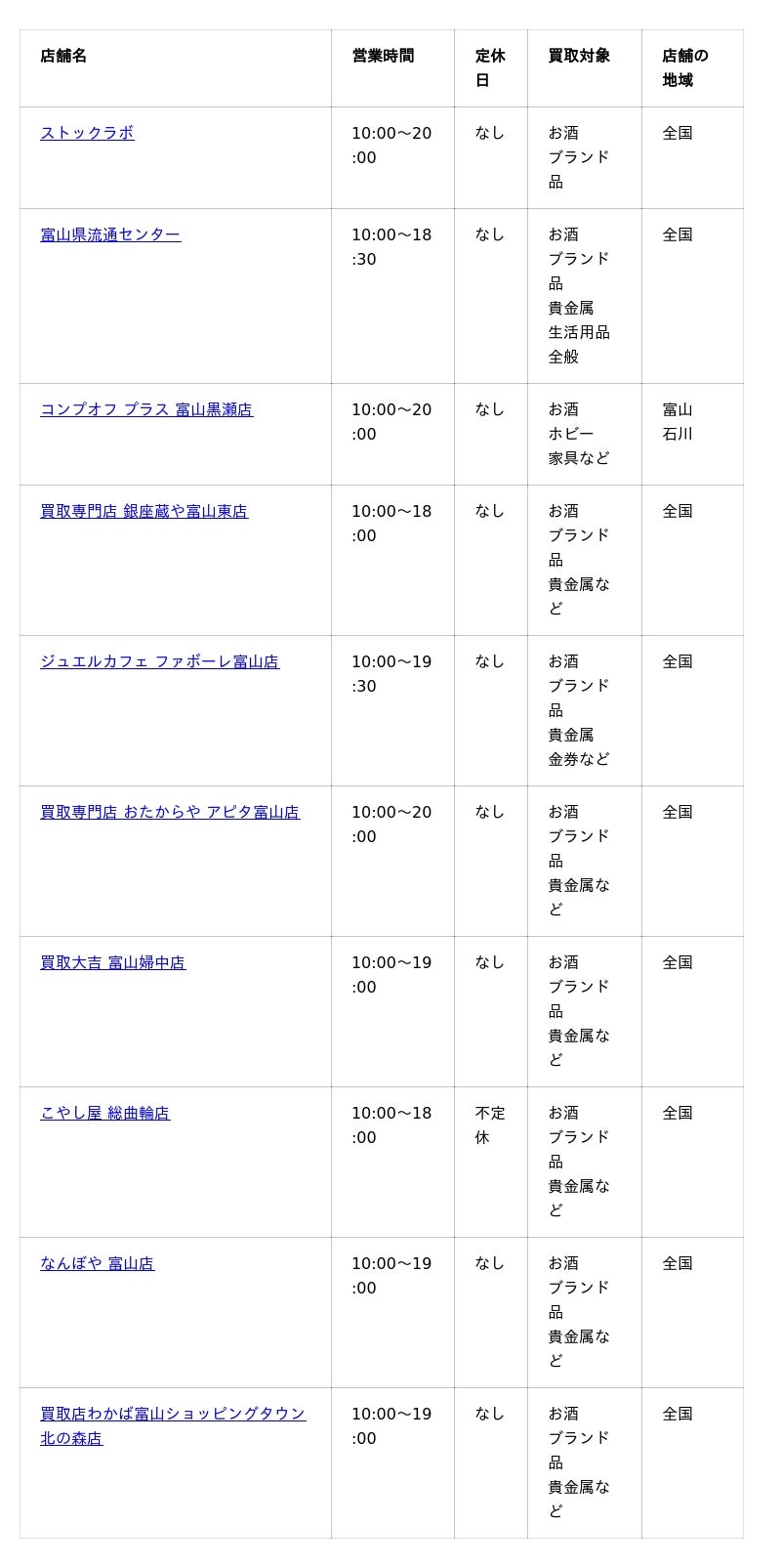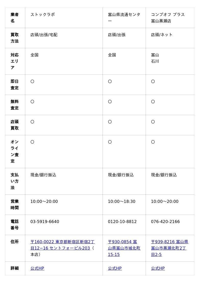 まずは、今回ご紹介する各業者の営業時間、定休日、買取対象品目などをまとめた一覧表からご確認ください。
