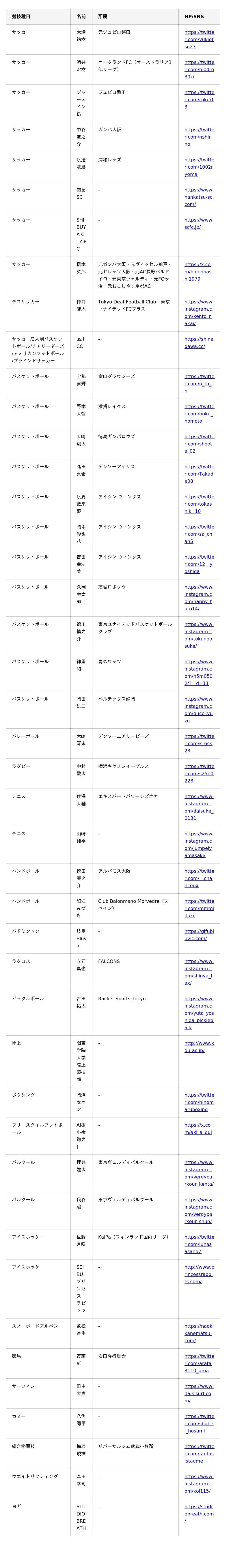 <BASE UP SPORTS サプライヤー契約一覧(現時点)>