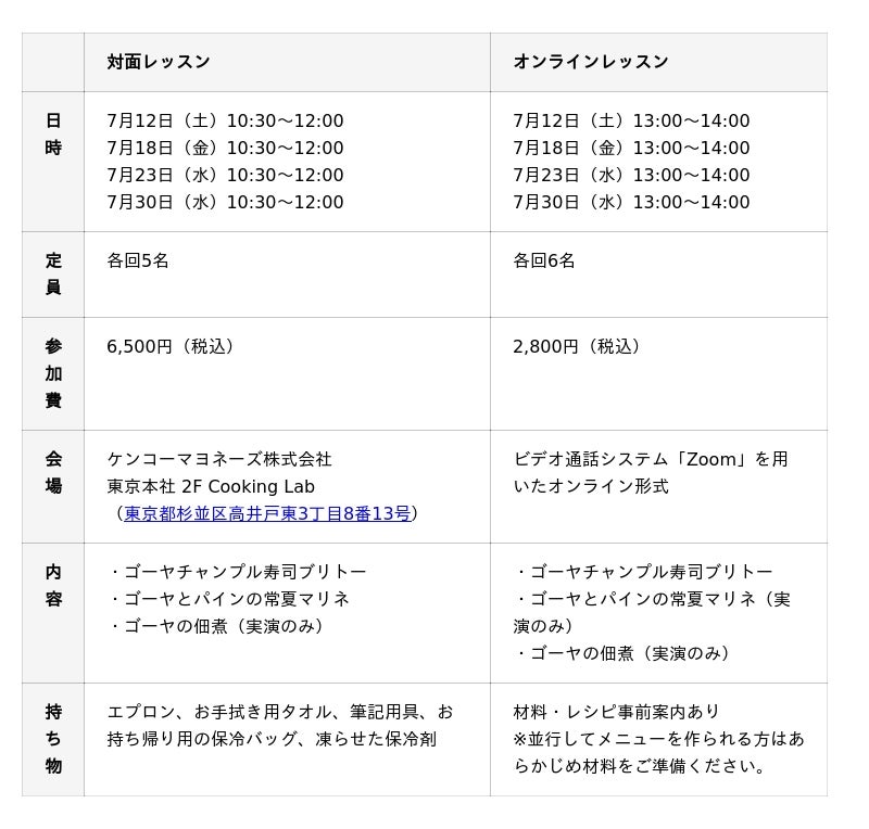 ケンコーマヨネーズ株式会社(東京本社:東京都杉並区、 代表取締役社長:島本 国一、以下「当社」)は、当社で運営する一般のお客様向けの料理教室「キッチンスペース831」にて、7月に開催するレッスンの募集を開始しました。