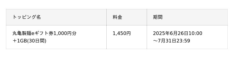 KDDI、沖縄セルラーは2025年6月26日からpovo2.0の期間限定トッピングとして、「1GB(30日間)」と全国の丸亀製麺の店舗で利用可能な「丸亀製麺eギフト券(1,000円分)」を1,450円で提供します。