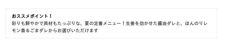 柔らかくてしっとりな蒸し鶏など7種の彩り鮮やかな具材が、選べる特製ダレと絡んで夏に嬉しいすっきりとした味わいです。