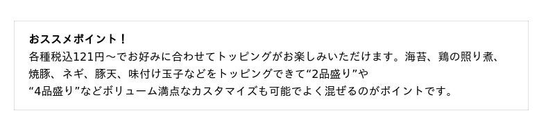 トッピングに迷われた方でも安心の“2品盛り”や“4品盛り”も登場!がっつりで満足度抜群の一杯です。