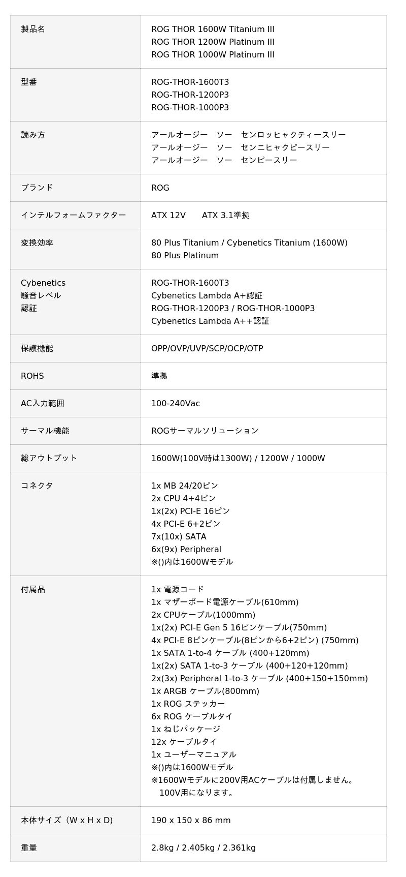 「ROG-THOR-1600T3」「ROG-THOR-1200P3」「ROG-THOR-1000P3」